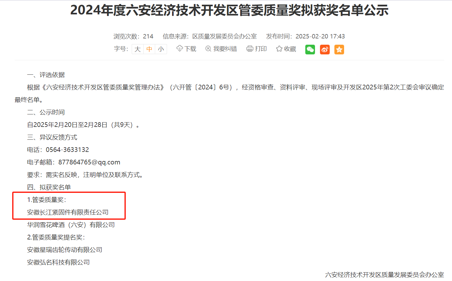榮獲2024年度六安經(jīng)開(kāi)區(qū)管委質(zhì)量獎(jiǎng)